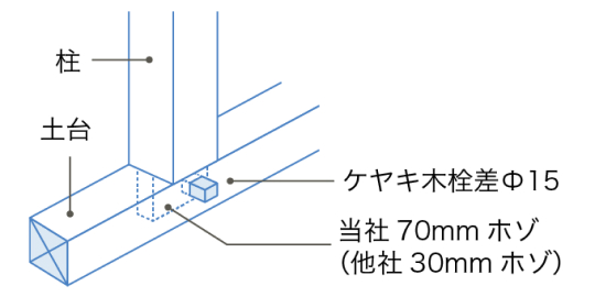 外周すべての柱と土台の接合部に木栓を差し込み、隙間なく固定。万が一構造用金物が取れたとしても崩壊を防ぐことが可能な構造となっています。
